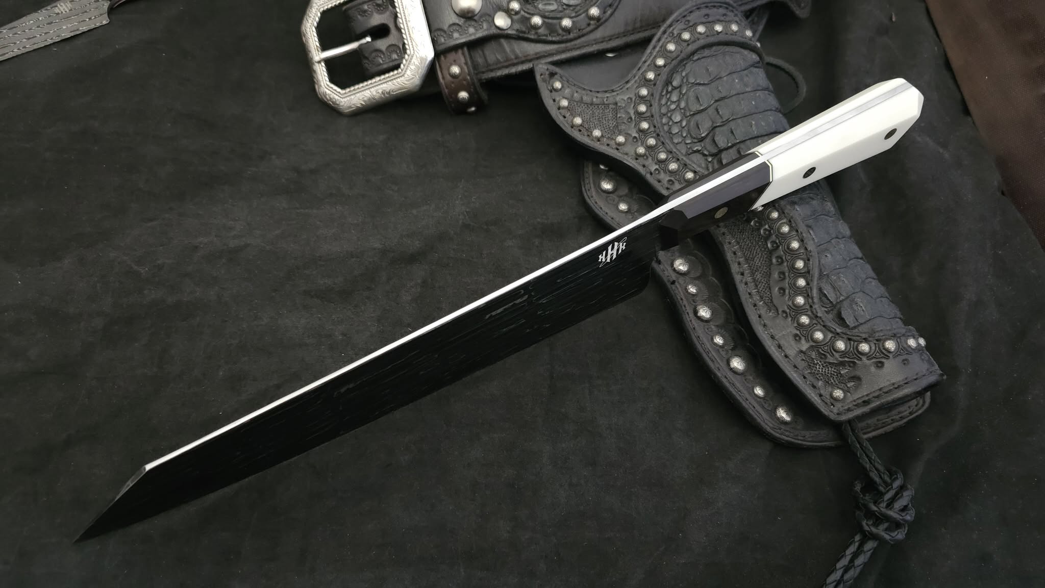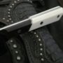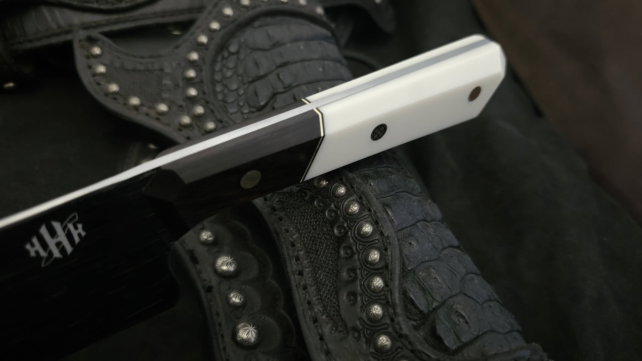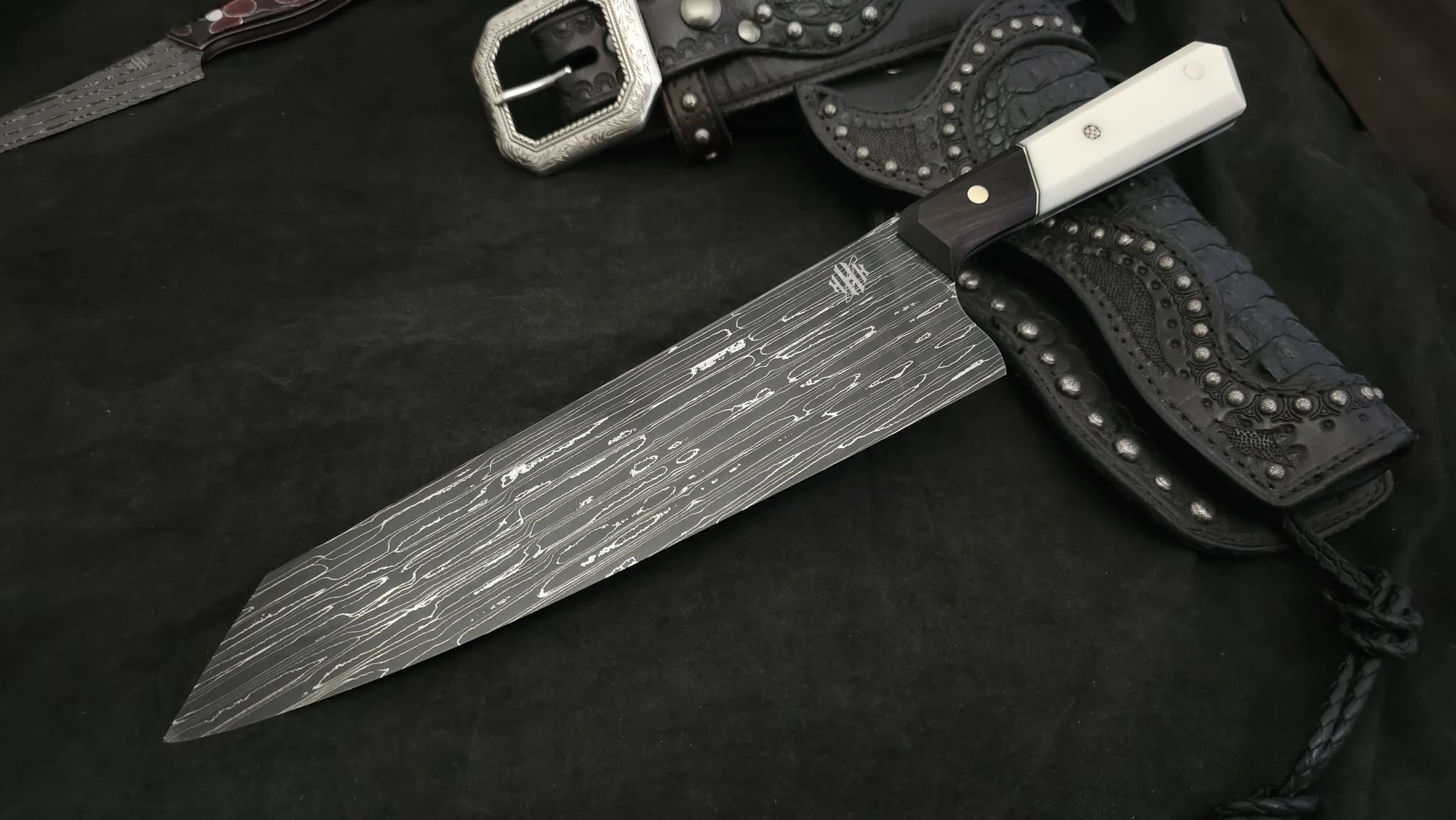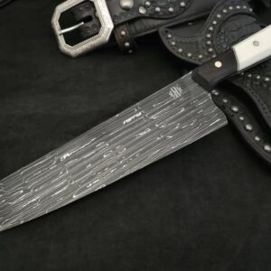 Here we have an example of the beauty of simplicity, a basic ivory Micarta handle paired with an African Blackwood bolster and a brass and g10 spacer to make the contrast between the white and black SHINE. with a traditional Japanese Wa handle shape on a full tang providing that classic Japanese kitchen knife feel in the hand. The Blade has a slight convex on both sides for food release. all around its built like a workhorse, this is the knife you want if you’re gonna be prepping food for hours.