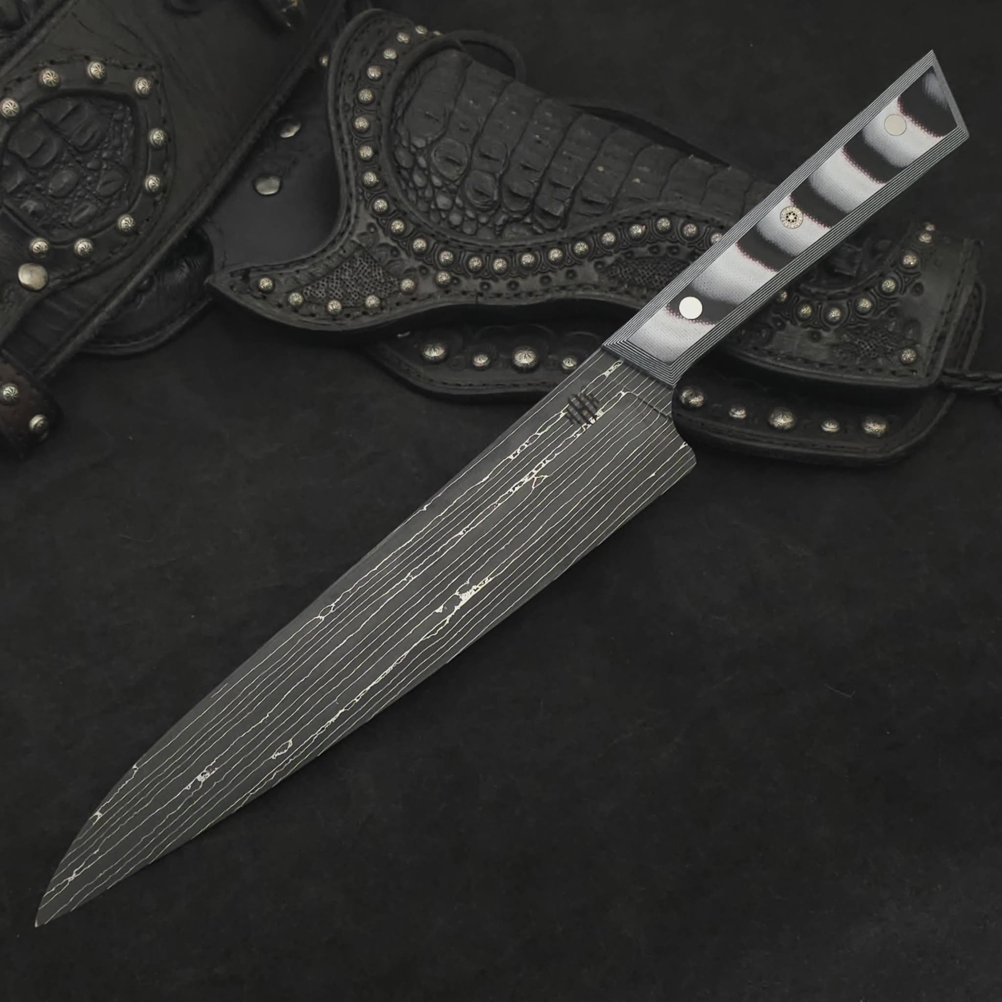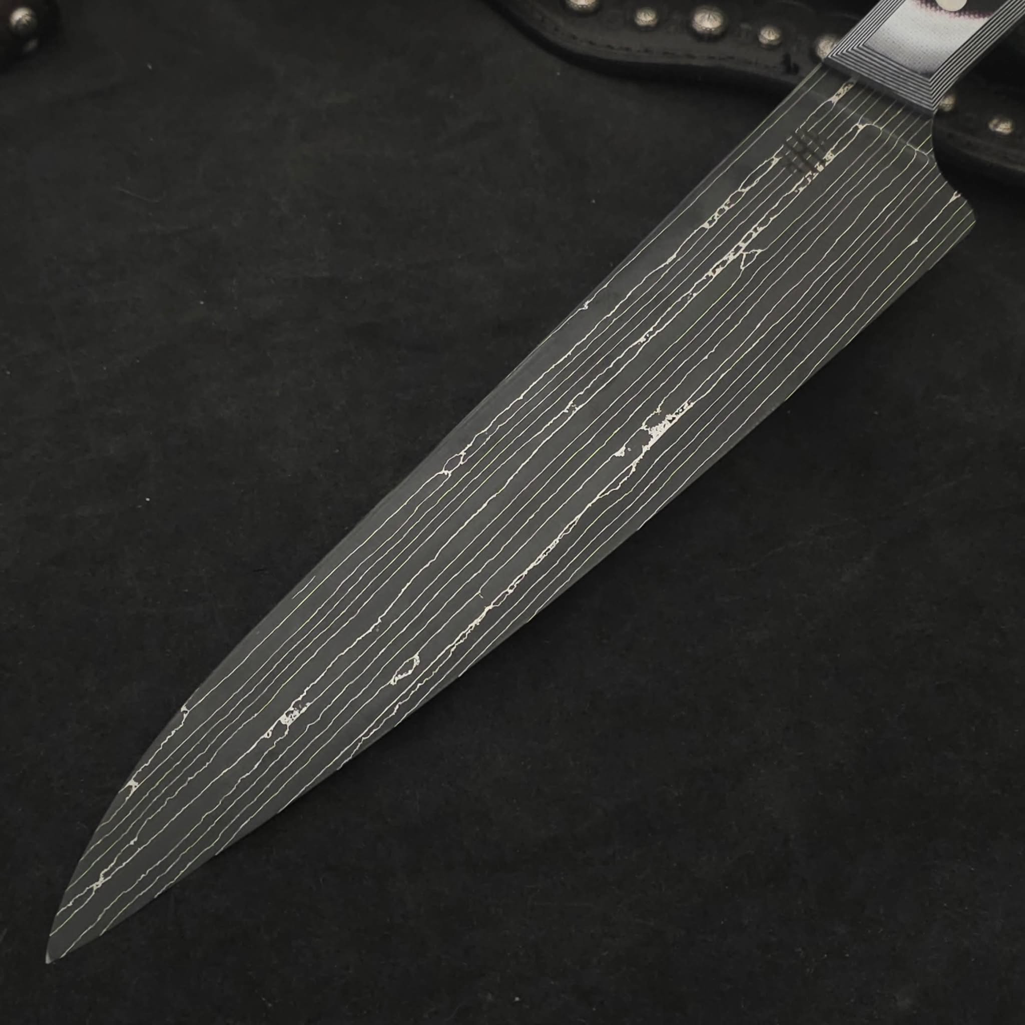 Be careful and don”t stare at the handle too long, or else you’ll start seeing things! Overall a more simple piece but still packed with the care we put into every knife we make. Quite noticeable from a distance and guaranteed to stand out amongst the crowd of knives in any discerning chefs knife block.