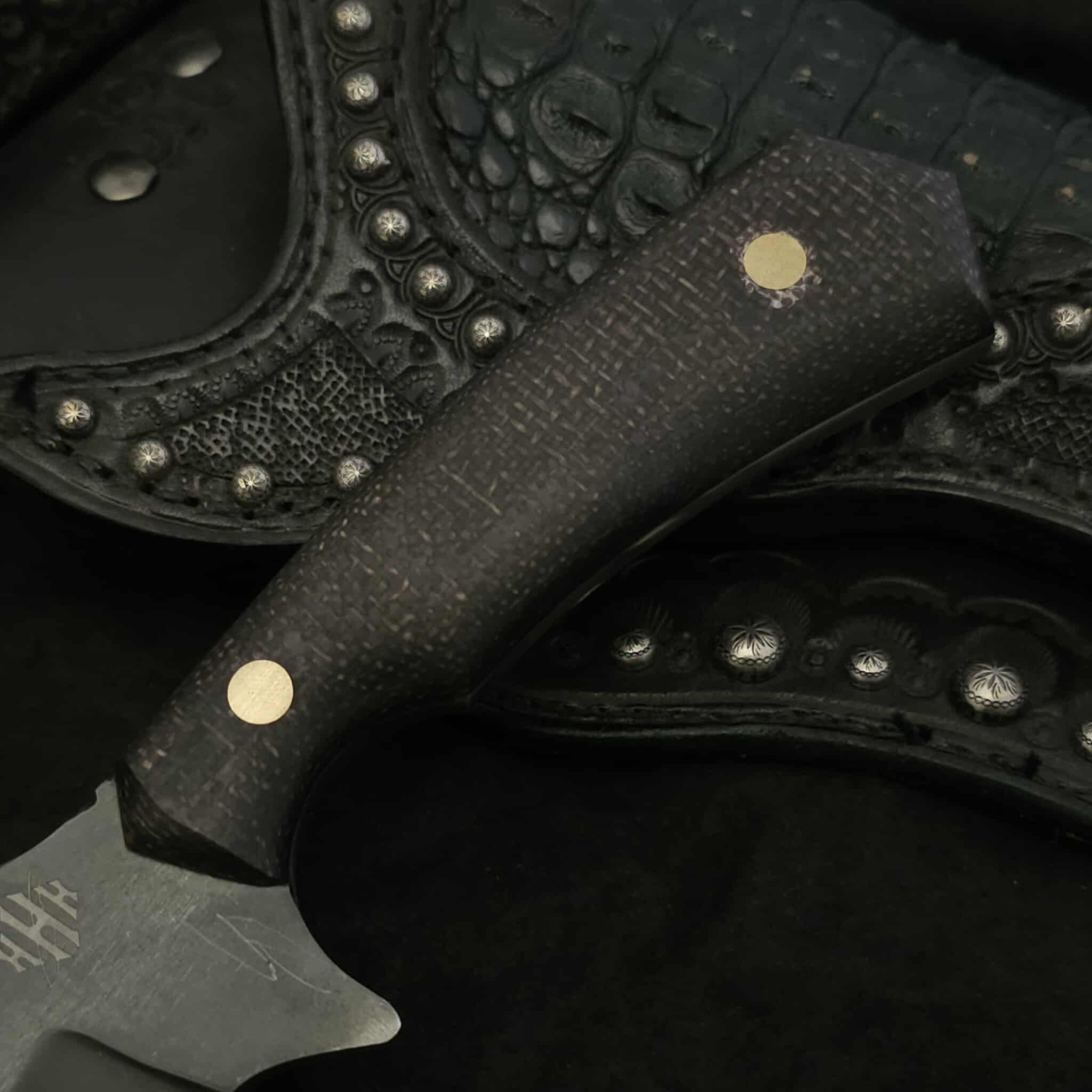Material: black burlap micarta to a 800 grit finish with brass corby bolts.