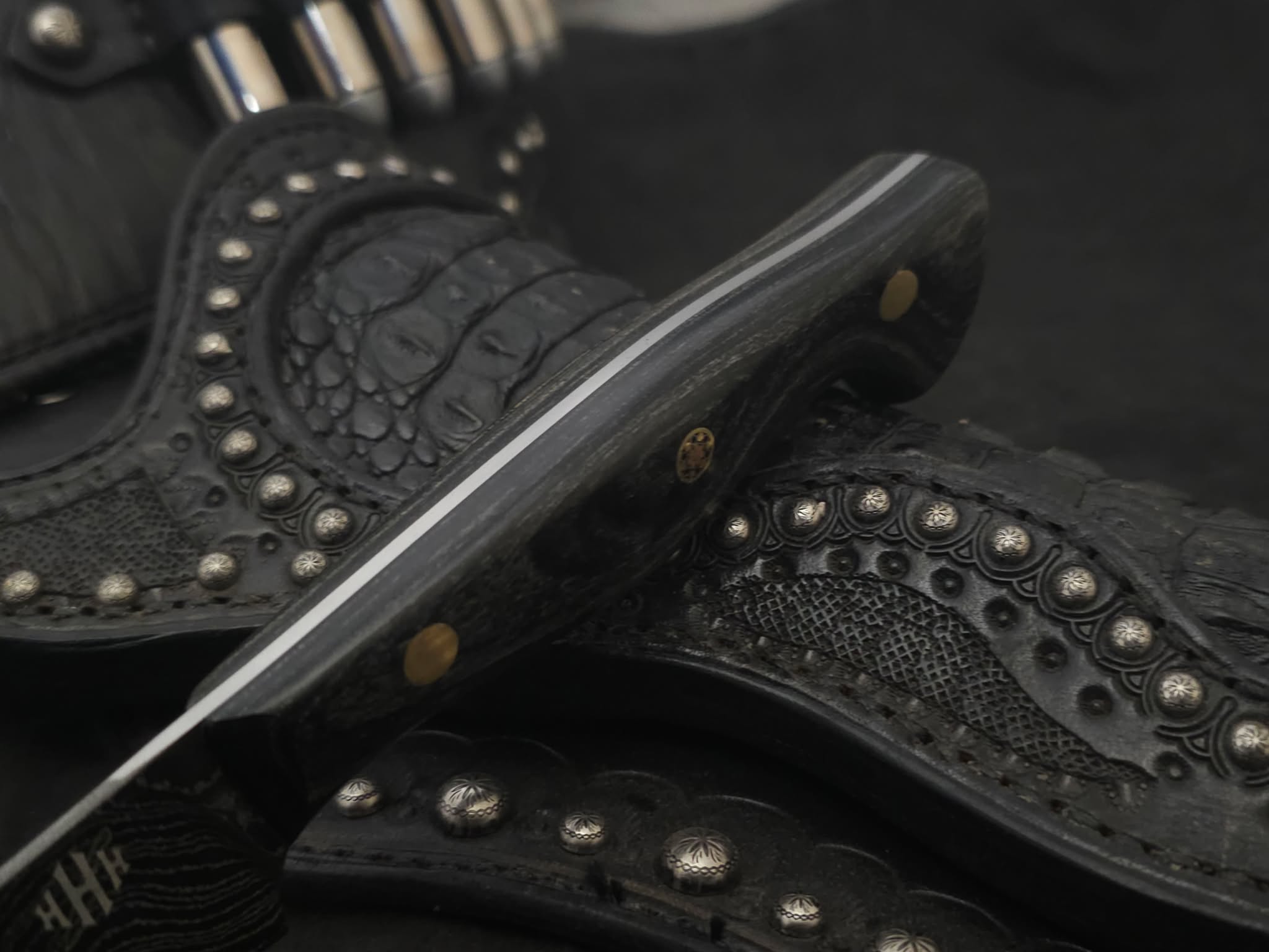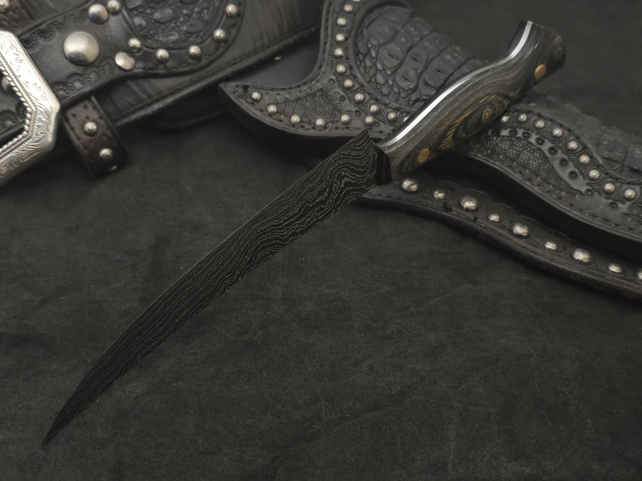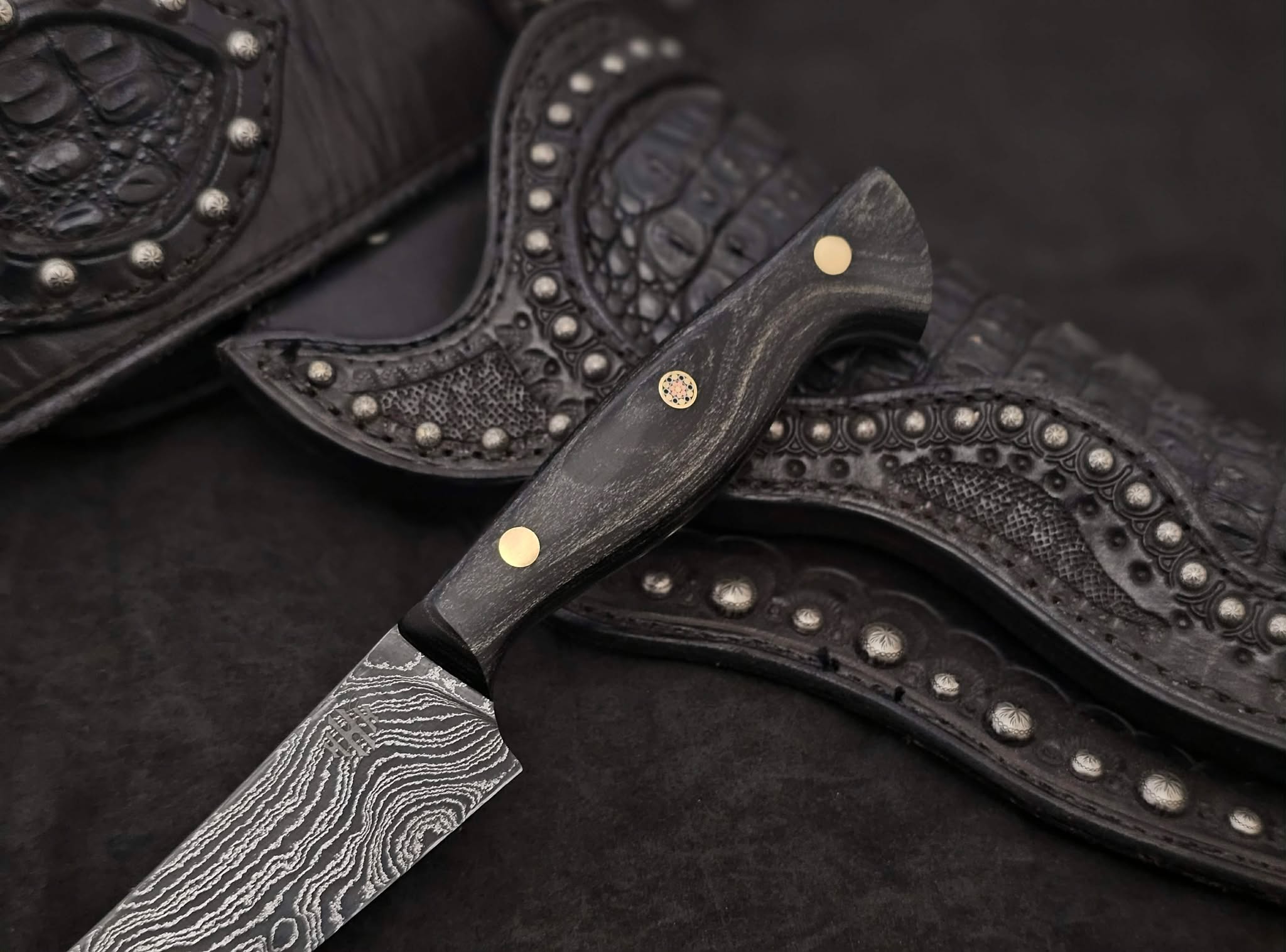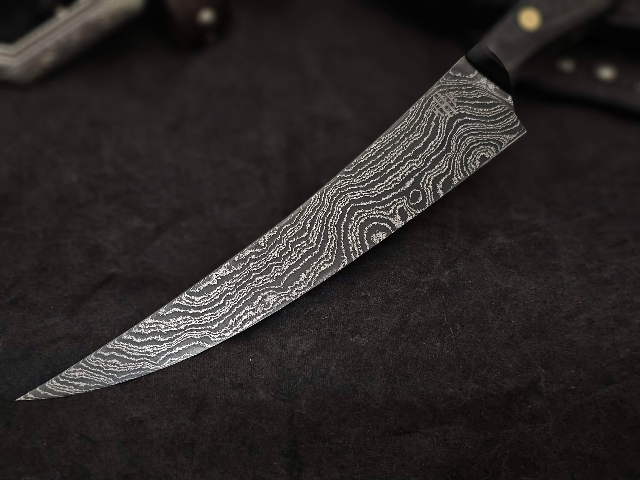 Your new favourite kitchen knife, not too tall, not too long, its Juuuuuuust riiiiight. i dont remember what the material is called exactly but its layered African black-wood and pressed it under high pressure and heat to get to the point it is now.